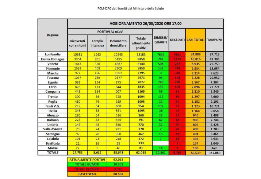 Casi di Covid-19 in Italia aggiornati a giovedì 26 marzo 2020