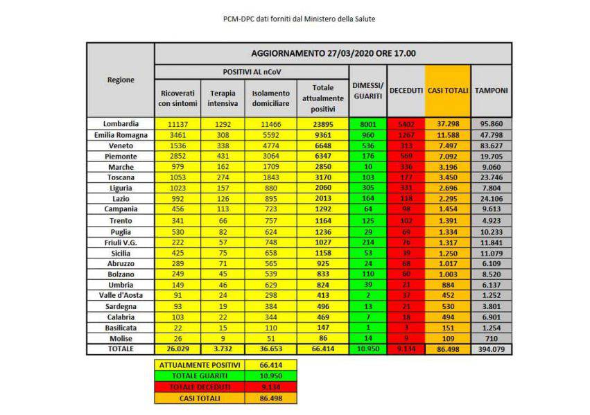 Casi di Covid-19 in Italia aggiornati a venerdì 27 marzo 2020