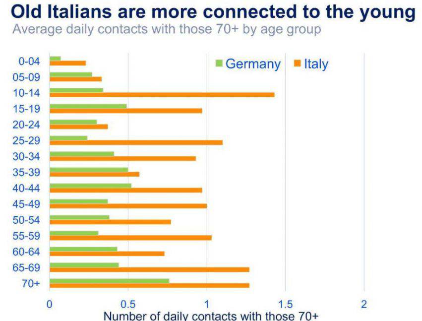 Come mai allora in Italia si ammalano così tanti anziani di COVID-19? Un interessante spunto proviene da uno studio del 2008, intitolato “Social contacts and mixing patterns relevant to the spread of infectious disease“, che individua tra i fattori la frequenza di contatto tra gli over settanta e i più giovani. Rispetto ai tedeschi gli italiani over 65 hanno il doppio di possibilità di contatti giornalieri ravvicinati con la popolazione più giovane, quindi molto più esposti. Un fenomeno che si può intuire, probabilmente, anche per il fatto che in Italia i nonni sono molto presenti nella vita dei nipoti, e viceversa, per piacere ma anche per necessità.