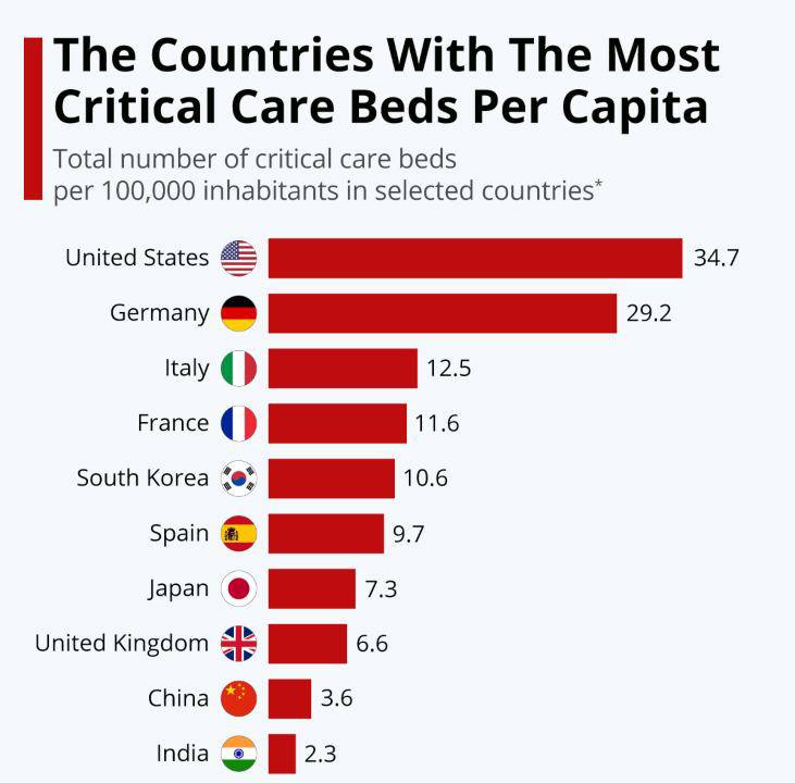 4- Il numero dei posti disponibili in terapia intensiva. Secondo i dati in Italia abbiamo 12,5 posti letto ogni 100.000 abitanti, in Germania invece i posti letto sono 29,2 ogni 100 mila abitanti, più del doppio. A ciò si aggiunge il fatto che purtroppo il 60% dei morti in Italia sono cittadini della Lombardia, la regione che al momento ha il sistema sanitario in forte difficoltà, come denunciato più volte da medici e infermieri. Molte persone muoiono in casa, senza riuscire ad arrivare in ospedale e a molte non viene fatto il tampone, quindi non sono neanche certificati come decessi da coronavirus. Ciò significa che se la Lombardia non fosse stata aggredita così velocemente e inaspettatamente dal virus e se i posti letto fossero stati come quelli della Germania, il numero dei morti lombardi, e quindi italiani, sarebbe stato molto diverso.