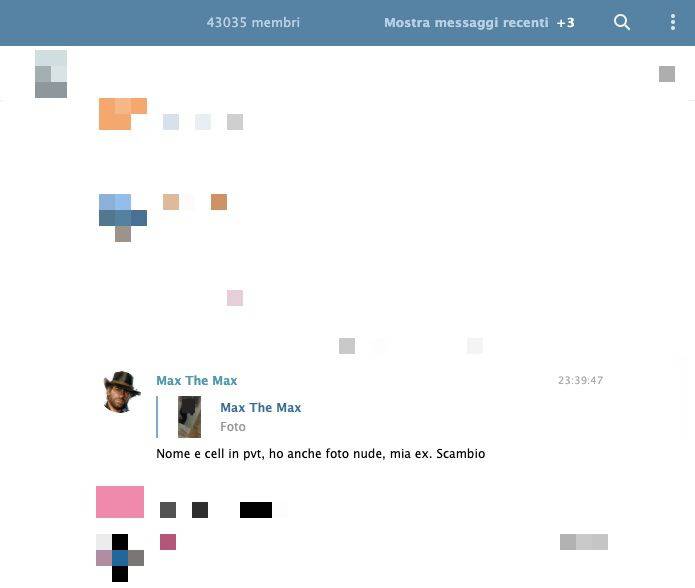 Su Telegram gira una chat tutta dedicata al revenge porn, atto punibile in Italia, dove gli uomini postano foto di ex, di donne incontrate per caso, ed anche di bambine. Vittime anche i Ferragnez, che hanno denunciato pubblicamente.