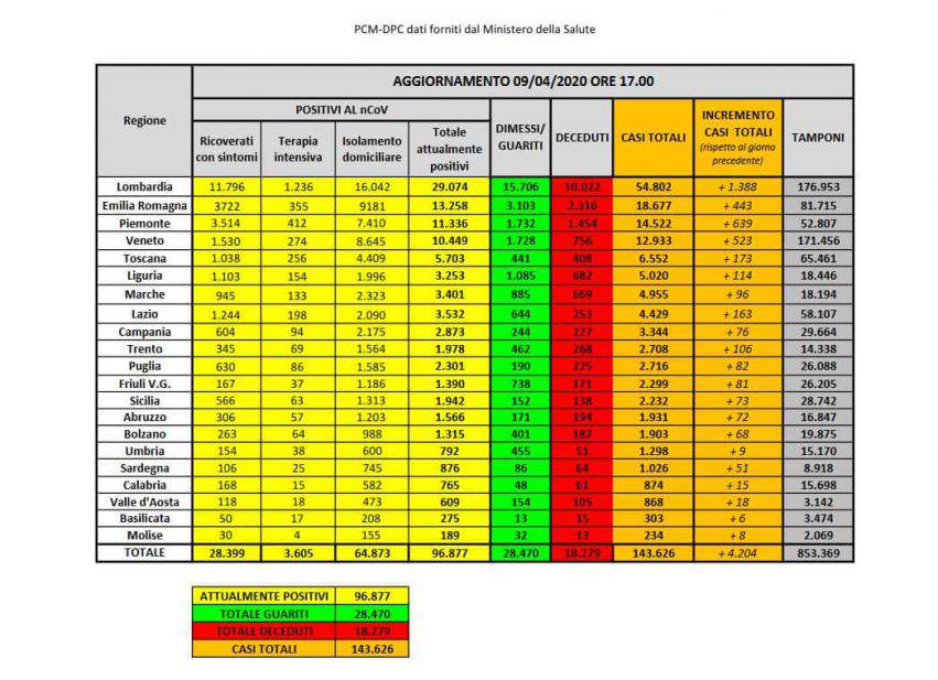 Casi di Covid-19 in Italia aggiornati a giovedì 9 aprile 2020