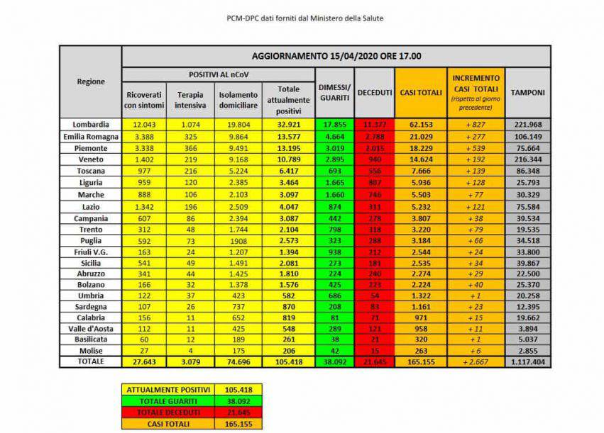 Casi di Covid-19 in Italia aggiornati a mercoledì 15 aprile 2020