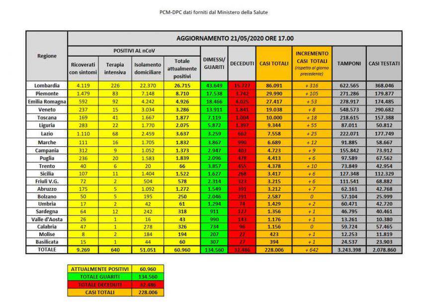 Casi di Covid-19 in Italia aggiornati a giovedì 21 maggio 2020