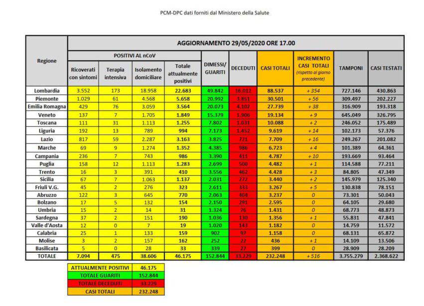 Casi di Covid-19 in Italia aggiornati a venerdì 29 maggio 2020