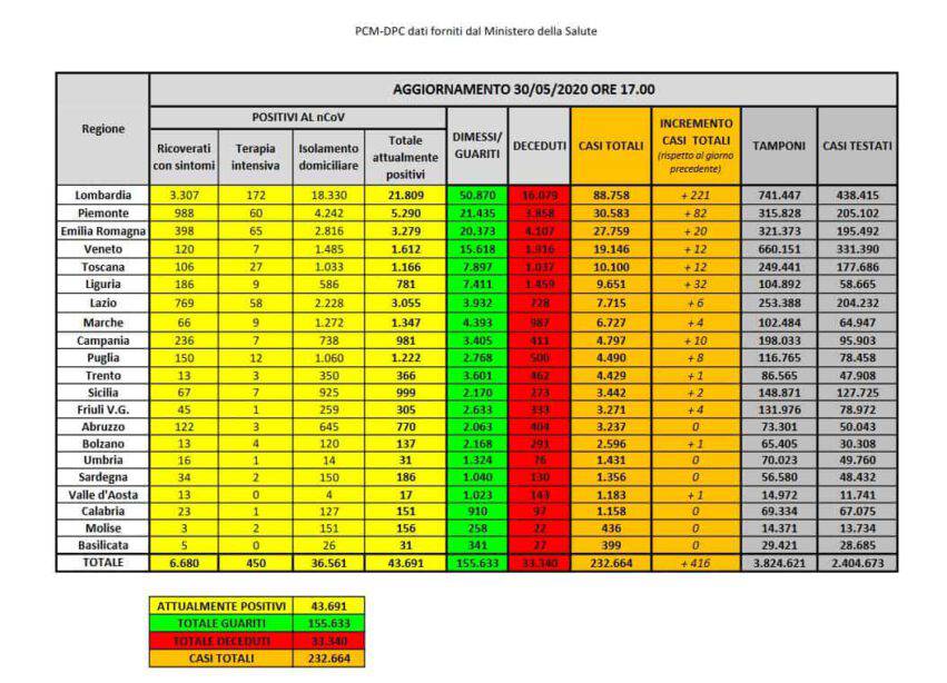 Casi di Covid-19 in Italia aggiornati a sabato 30 maggio 2020