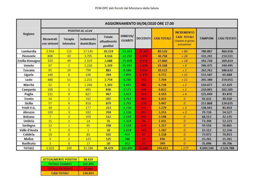 Casi di Covid-19 in Italia aggiornati a giovedì 4 giugno 2020