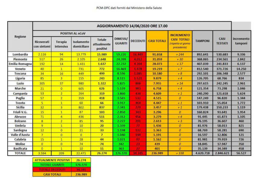 Casi di Covid-19 in Italia aggiornati a domenica 14 giugno 2020