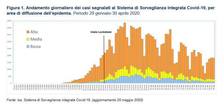 Il Rapporto Istat e Iss, sulla mortalità della popolazione residente in Italia nel primo quadrimestre 2020, segnala il numero massimo di casi di Covid-19 in Italia nel mese di marzo, con 113.011 casi. Il picco è stato raggiunto il 20 marzo, poi i casi hanno cominciato a diminuire. Nel mese di aprile sono stati segnalati 94.257 contagi da Covid-19 in Italia, anche se molti decessi avvenuti durante il mese hanno riguardato persone che avevano ricevuto una diagnosi a marzo. Un ulteriore calo si è registrato a maggio con soli 18.706 casi, anche se il mese non è completo, perché i dati acquisiti dal Rapporto sono aggiornati fino al 25 maggio.
