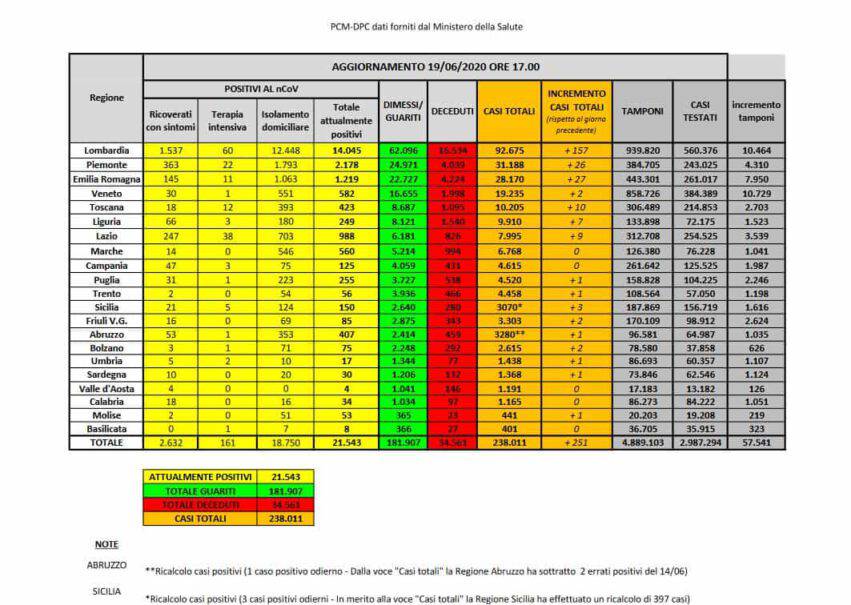 Casi di Covid-19 in Italia aggiornati a venerdì 19 giugno 2020