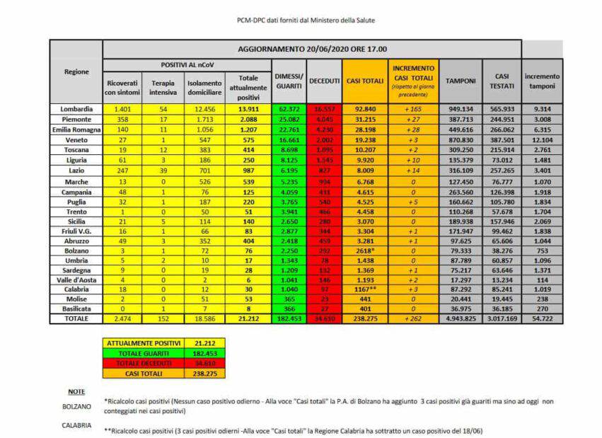 Casi di Covid-19 in Italia aggiornati a sabato 20 giugno 2020