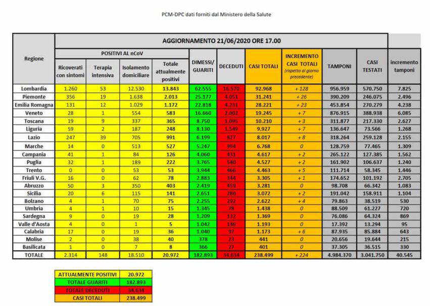 Casi di Covid-19 in Italia aggiornati a domenica 21 giugno 2020