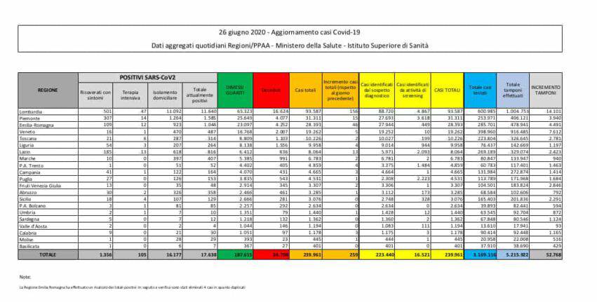 Casi di Covid-19 in Italia aggiornati a venerdì 26 giugno 2020
