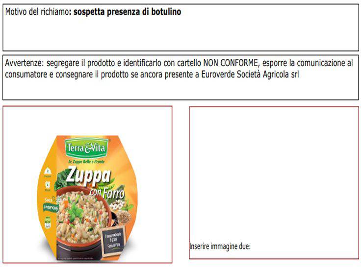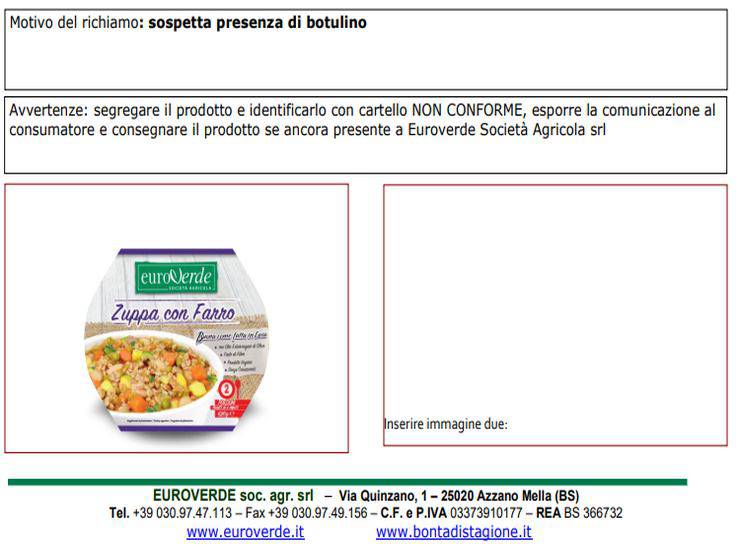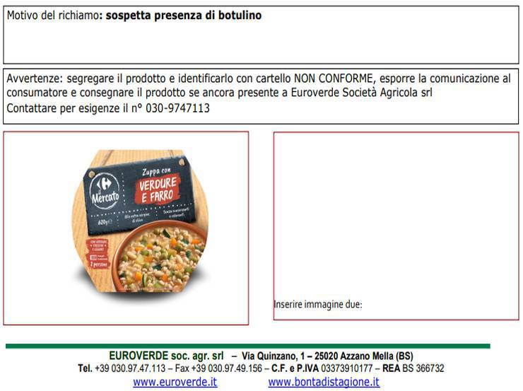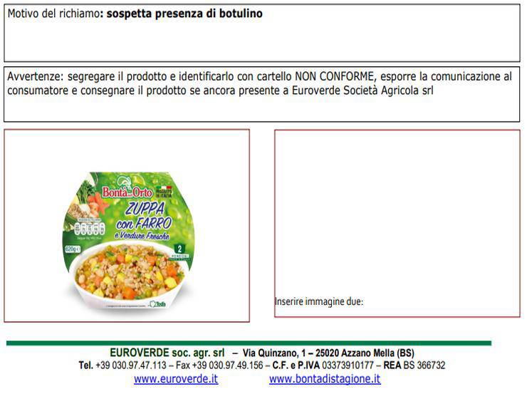 Il motivo del richiamo è la presenza sospetta di botulino. Inoltre, sul modulo diffuso dall’azienda si chiede ai supermercati di “segregare il prodotto e identificarlo con cartello NON CONFORME, esporre la comunicazione al consumatore e consegnare il prodotto se ancora presente a Euroverde Società Agricola”.