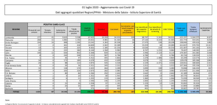 Casi di Covid-19 in Italia aggiornati a mercoledì 1° luglio 2020