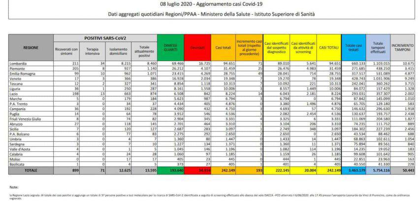 Casi di Covid-19 in Italia aggiornati a mercoledì 8 luglio 2020