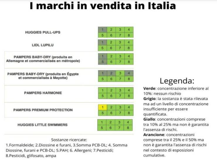Sono state analizzate anche marche di pannolini che si trovano anche in commercio in Italia. Anche se nei limiti, una sostanza che è ancora presente nei pannolini è la formaldeide. Si tratta di un composto organico volatile (COV), cioè un gas nocivo per la salute dell’uomo. Dal 2004 l’Associazione Italiana per la Ricerca sul Cancro ha dichiarato che la formaldeide è cancerogena, inserendola nell’elenco delle sostanze cancerogene per l’uomo. Si trova in tantissimi prodotti che si usano quotidianamente, si usa molto nell’azienda chimica, in quella cosmetica ed anche in quella tessile. La situazione non giustifica un richiamo dei prodotti, ma viene chiesto agli operatori interessati di approfondire la diagnosi entro sei mesi.