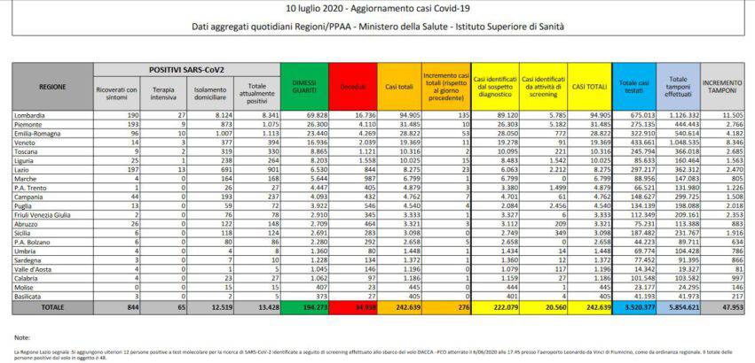 Casi di Covid-19 in Italia aggiornati a venerdì 10 luglio 2020