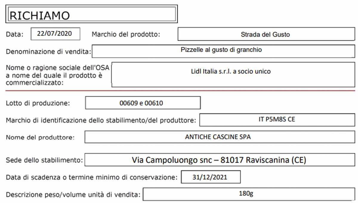 Il richiamo riguarda due lotti di uno stesso prodotto che viene venduto nei supermercati discount Lidl che sono ormai presenti su tutto il territorio nazionale. Nello specifico si tratta di due lotti di Pizzelle al gusto granchio a marchio vendute appunto da Lidl Italia s.r.l..