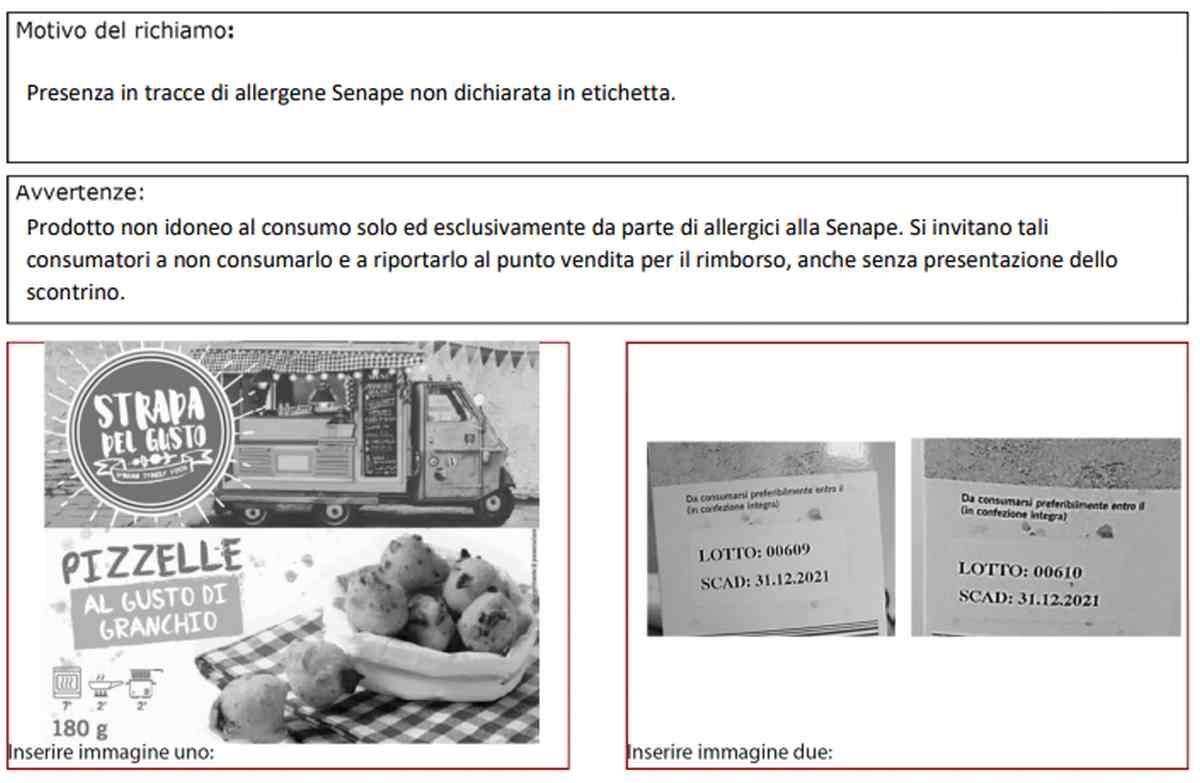 Come si legge dalla nota il motivo del richiamo è la presenza in tracce di un allergene: la Senape non dichiarata in etichetta. Il prodotto non è idoneo al consumo, fanno sapere dall’azienda, solo ed esclusivamente da parte di allergici alla Senape. Per questo motivo chi è allergico non lo deve consumare e riportarlo al punto vendita per ottenere un rimborso anche se non si ha più lo scontrino.