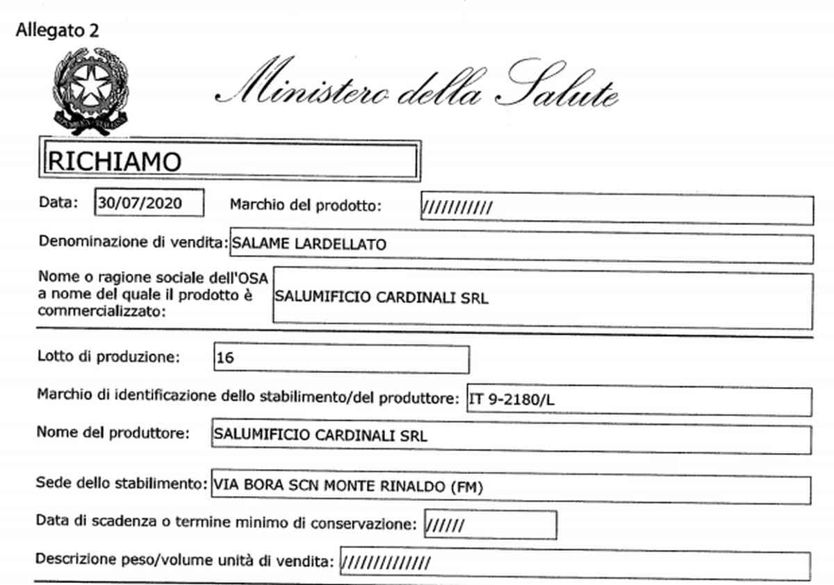Il richiamo che oggi vi segnaliamo è quello di un lotto di salame lardellato commercializzato da un’azienda delle marche.