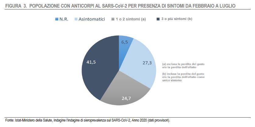 Le persone sintomatiche che hanno sviluppato anticorpi, invece, si distinguono tra coloro che hanno avuto uno o due sintomi, esclusa la perdita dell’olfatto e o del gusto, che sono il 24,7% e coloro che hanno avuto almeno tre sintomi, inclusa la perdita dell’olfatto e o del gusto, che sono il 41,5%.