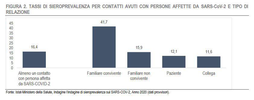 I risultati dell’indagine confermano inoltre che aver avuto contatti con persone affette dal virus aumenta la probabilità che si siano sviluppati anticorpi. In questo caso, infatti, la prevalenza sale al 16,4%. In Lombardia si arriva al 24%. I valori più alti riguardano i contatti con i familiari conviventi infettati da SARS-CoV-2 , che hanno portato alla sviluppo di anticorpi nel 41,7% dei casi. Il tasso di sieroprevalenza scende al 15,9% se il familiare non risulta convivente, ma resta comunque largamente superiore al valore medio dell’intera popolazione (2,5%).