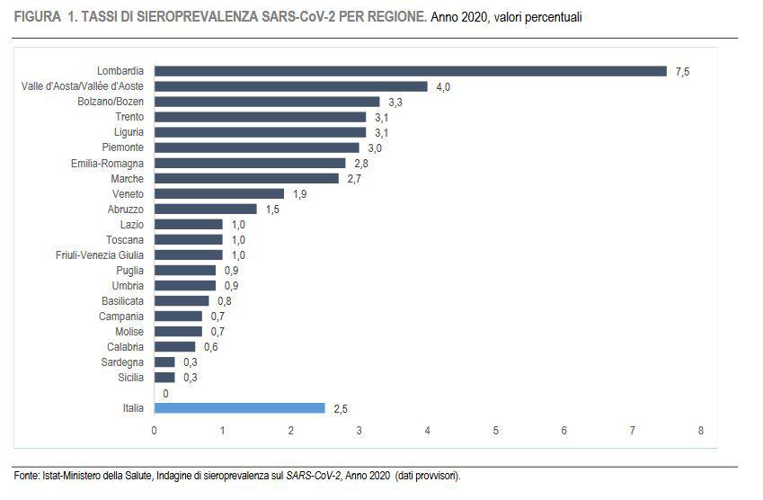 Dopo la Lombardia, la seconda regione italiana con il più alto livello di sieroprevalenza è la Valle d’Aosta con il 4%. Seguono diverse regioni con un tasso intorno al 3%: Piemonte (3%), Provincia Autonoma di Trento (3,3%), Provincia Autonoma di Bolzano (3,3%), Liguria (3,1%), Emilia-Romagna (2,8%) e Marche (2,7%). Il Veneto è all’1,9%, mentre otto regioni del Sud hanno un tasso di sieroprevalenza sotto all’1%, con la Sicilia e la Sardegna al livello minimo, entrambe allo 0,3%.