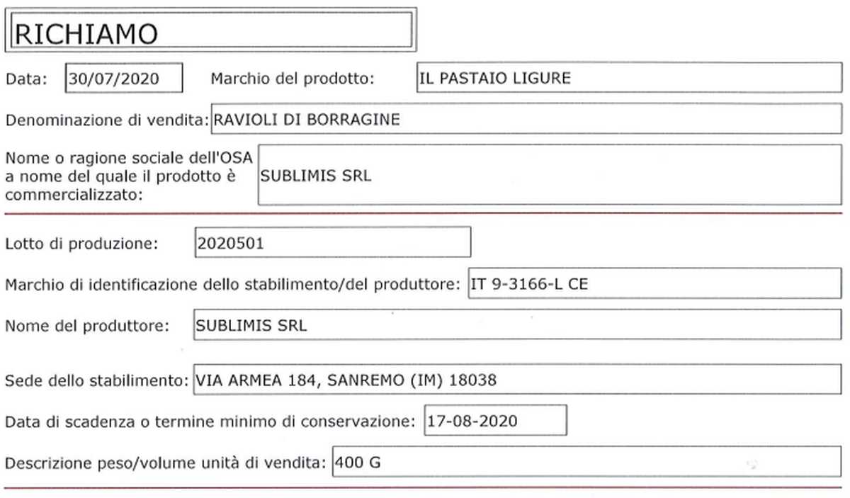 L’alimento richiamato sul sito del Ministero per la Salute è un lotto di pasta fresca prodotti a Sanremo, quindi nel nostro paese.