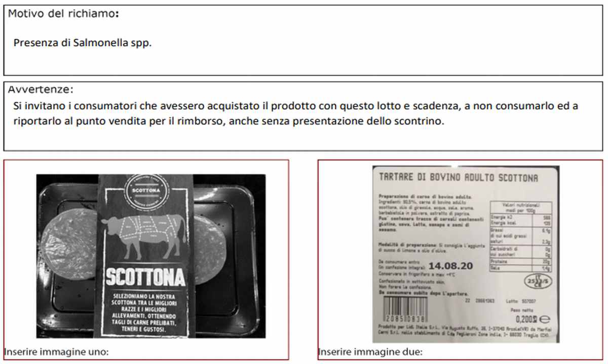 In data 10 agosto 2020, il Ministero della Salute ha pubblicato il richiamo di un lotto di tartare di bovino adulto – scottona, per un possibile rischio di contagio microbiologico per i consumatori. L’alimento potrebbe essere stato contaminato da uno dei batteri più diffusi negli alimenti, il batterio della salmonella spp.