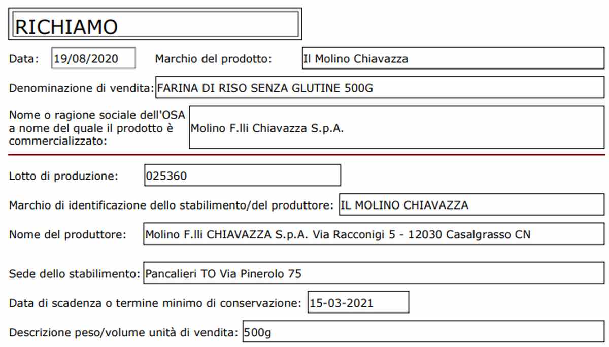 LEGGI ANCHE: RICHIAMO FARINA PER RISCHIO CHIMICO | MARCA E LOTTO | FOTO