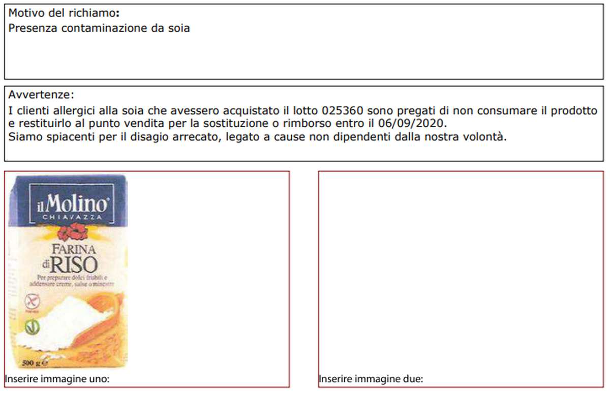 Si tratta del richiamo di un lotto di farina di riso senza glutine a marchio Il Molino Chiavazza, per una contaminazione da soia non dichiarata in etichetta.