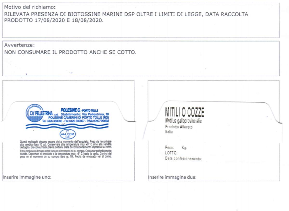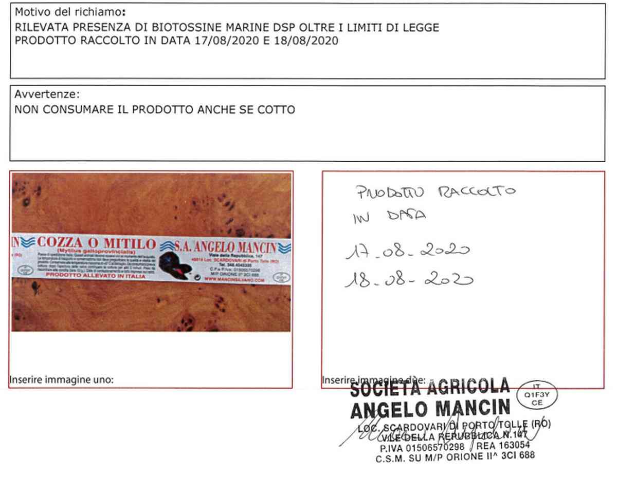 Secondo richiamo riguarda sempre cozze (Mytilus Galloprovicialis) della Società agricola Angelo Mancin: