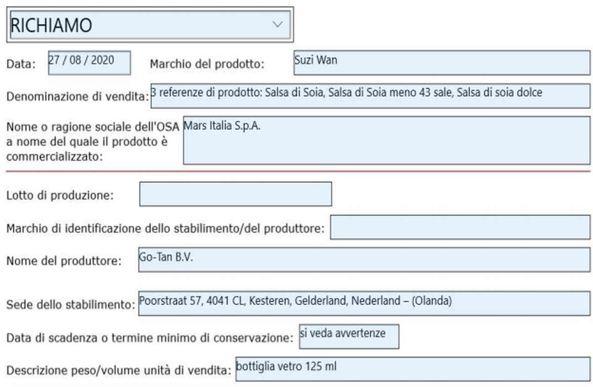 E’ stato necessario effettuare il richiamo di di alcuni lotti di salsa di soia per rischio fisico molto grave. Il lotto e la marca da controllare.
