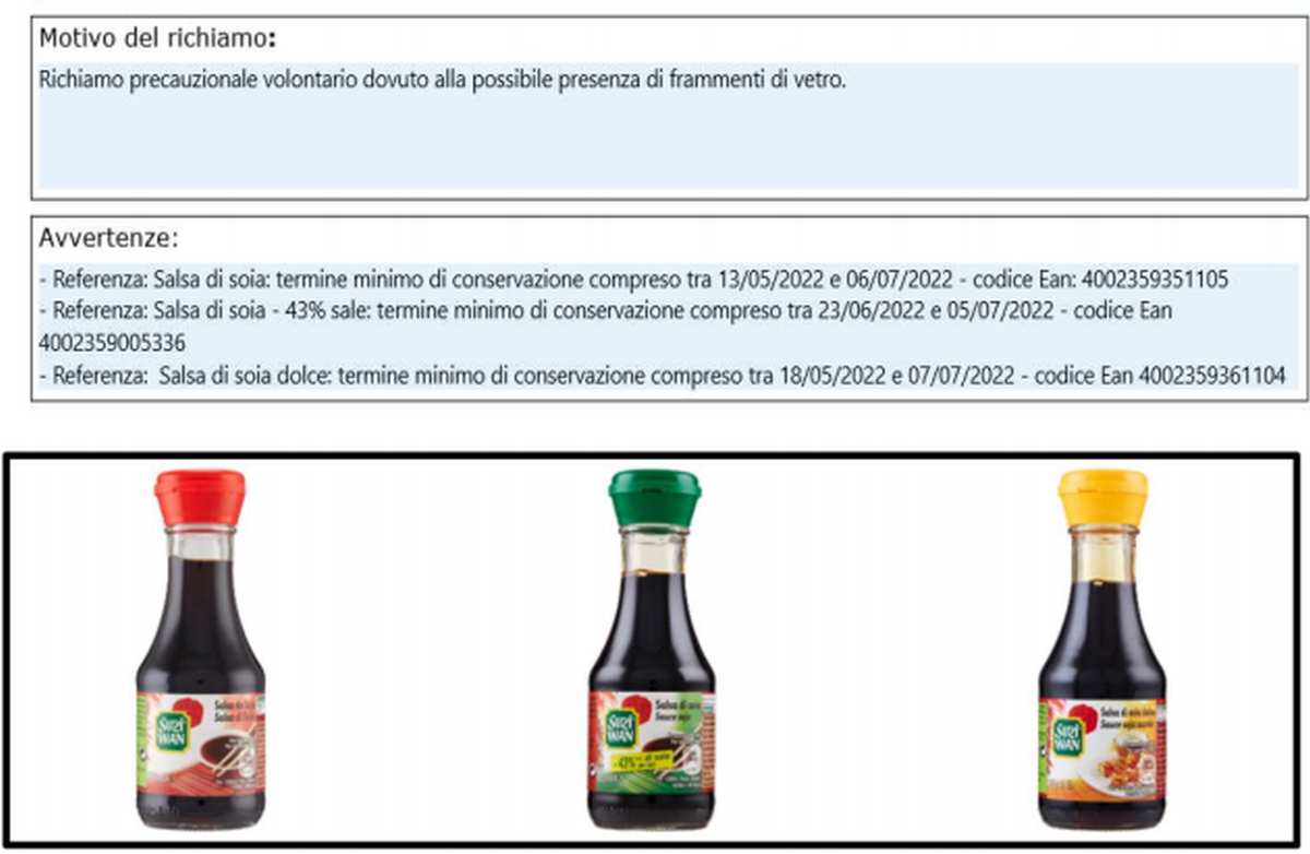 - Salsa di Soia dolce: termine minimo di conservazione tra 18/05/2022 e 07/07/2022 – Codice EAN 4002359361104.