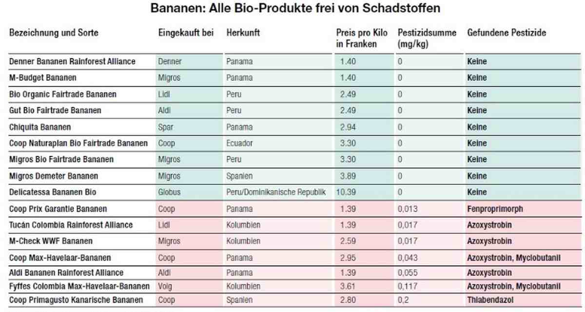 Il test è stato condotto in Svizzera e le banane analizzate sono di 16 marchi differenti. Gli esperti hanno cercato se sono presenti tracce di pesticidi che vengono usati nella coltivazione del frutto e fanno all’interno dell’alimento contaminandolo.
