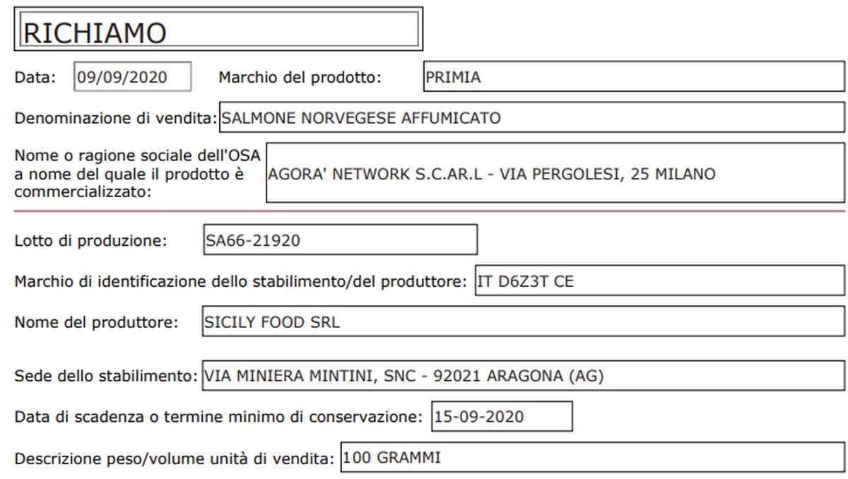 Nella nota il prodotto sottoposto a richiamo è un lotto di Salmone Norvegese Affumciato di Primia a causa di un rischio microbiologico. Sull’avviso di richiamo la data riportata per l’allerta è quella del 9 settembre 2020.