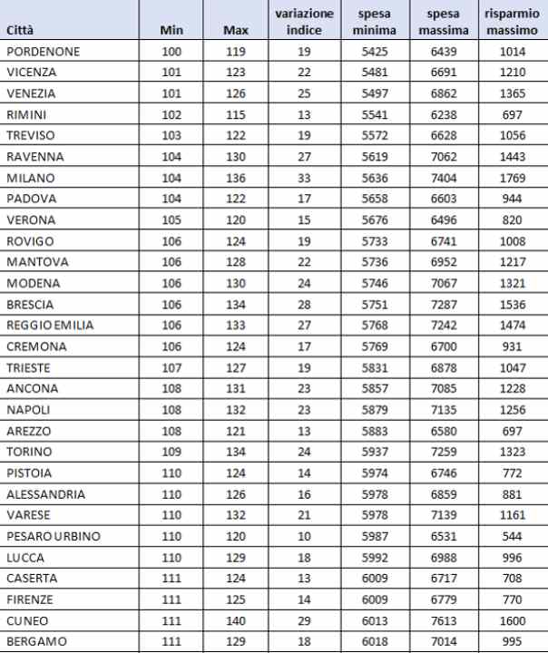 Ma spiccano anche Rimini e Treviso. Il meridione non fa concorrenza: bisogna arrivare alla 18ª posizione per trovare la prima città del sud, Napoli. Male anche a Taranto e Lecce e al Nord a Savona: in queste città si può arrivare a un risparmio annuo massimo di 300 €.