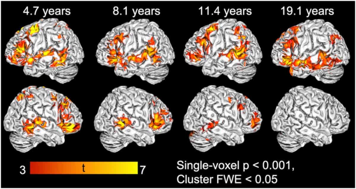 Lo studio dunque mostra che nei bambini piccoli, tra 4 e 6 anni, le funzione linguistiche sono caratterizzate da bilateralismo cerebrale. Mentre la loro lateralizzazione cerebrale avviene più tardi, in modo graduale, durante lo sviluppo del cervello dell’individuo. Secondo i ricercatori, il coinvolgimento dell’emisfero destro del cervello nell’elaborazione del linguaggio inizia a diminuire durante l’infanzia, dopo i sei anni di età, e nella prima fase dell’adolescenza, fino a scomparire con l’età adulta.