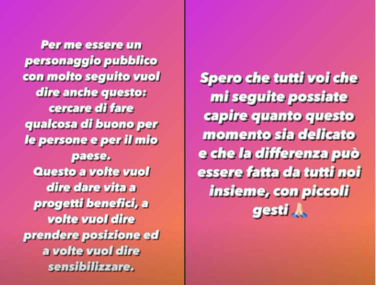 A ogni modo adesso è arrivato davvero il momento di questa influencer di intervenire in prima persona. Ecco che cosa ha detto Chiara Ferragni, sempre nelle storie di Instagram. “Ciao ragazzi, mi vorrei collegare anch’io alle stories che ha fatto ieri Fede perché penso che chiunque adesso abbia un grosso seguito abbia anche la responsabilità di sensibilizzare“.