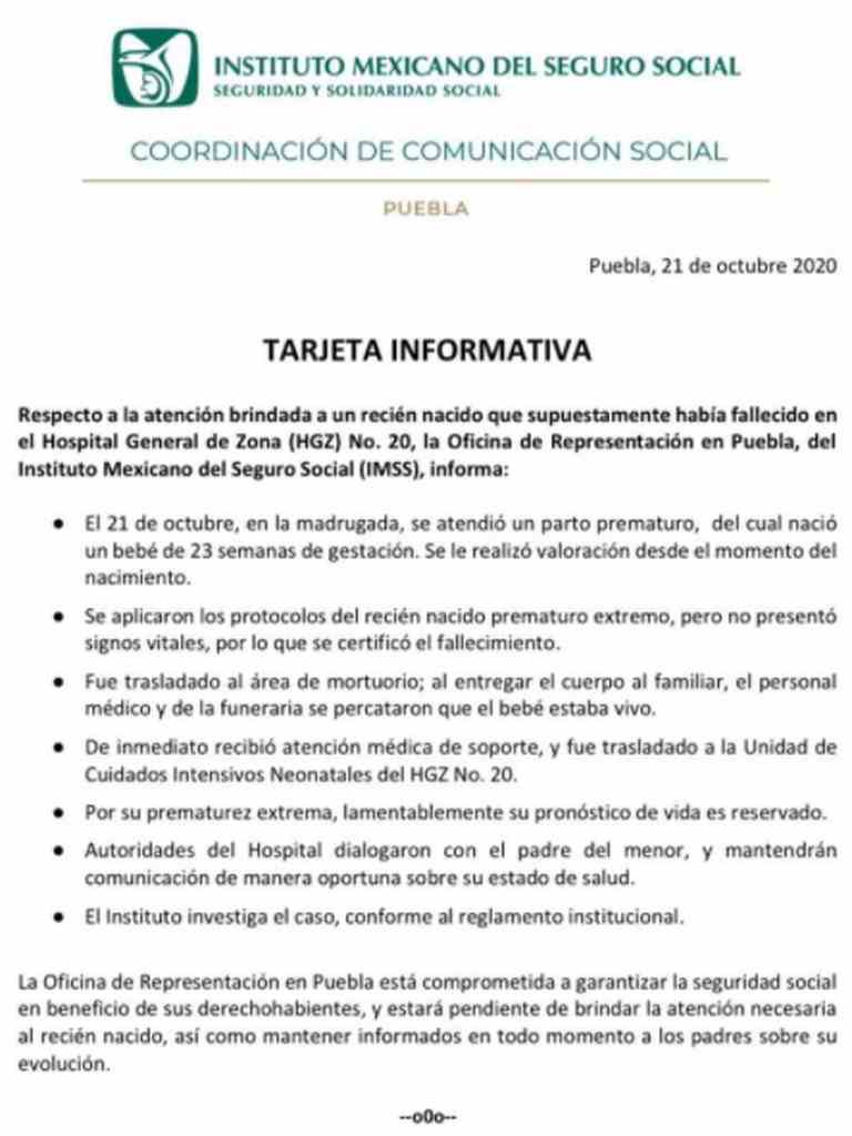I medici hanno dichiarato che il bambino ora è tenuto in osservazione nel reparto di rianimazione neonatale. Essendo molto prematuro non si sa come potrà evolvere la sua situazione. Ora l’IMSS, un’agenzia del sistema sanitario nazionale ha confermato l’apertura di un’inchiesta sul caso. I vari utenti dei social media hanno definito gli operatori dell’ospedale inetti e meritevoli di essere coinvolti in una causa.
