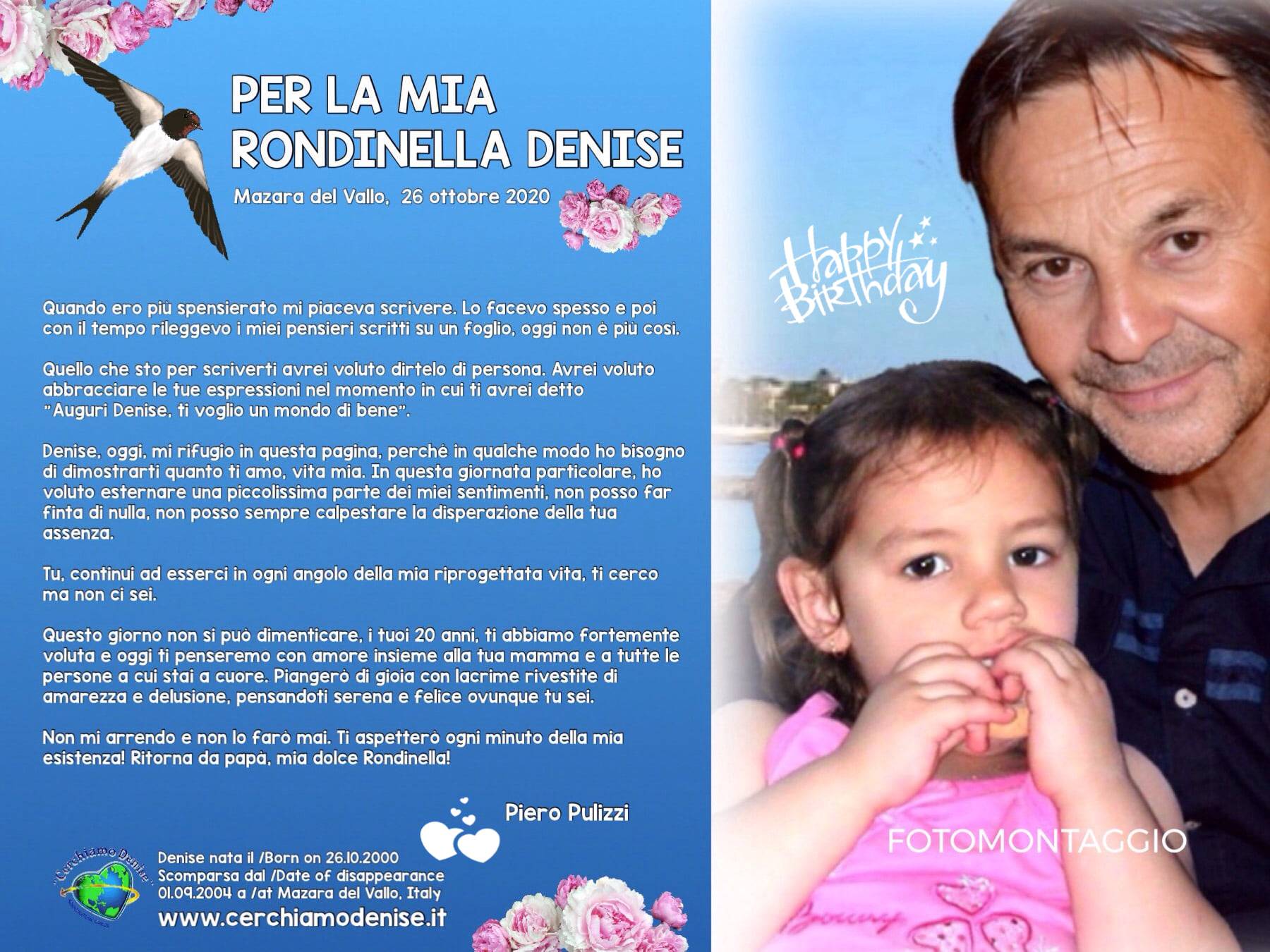 Il papà naturale di Denise, Pietro Pulizzi ha pubblicato sulla sua pagina Facebook un messaggio per la figlia chiamandola “Rondinella“: “Quando ero più spensierato mi piaceva scrivere. Lo facevo spesso e poi con il tempo rileggevo i miei pensieri scritti su un foglio, oggi non è più così. Quello che sto per scriverti avrei voluto dirtelo di persona. Avrei voluto abbracciare le tue espressioni nel momento in cui ti avrei detto “Auguri Denise, ti voglio un mondo di bene“.