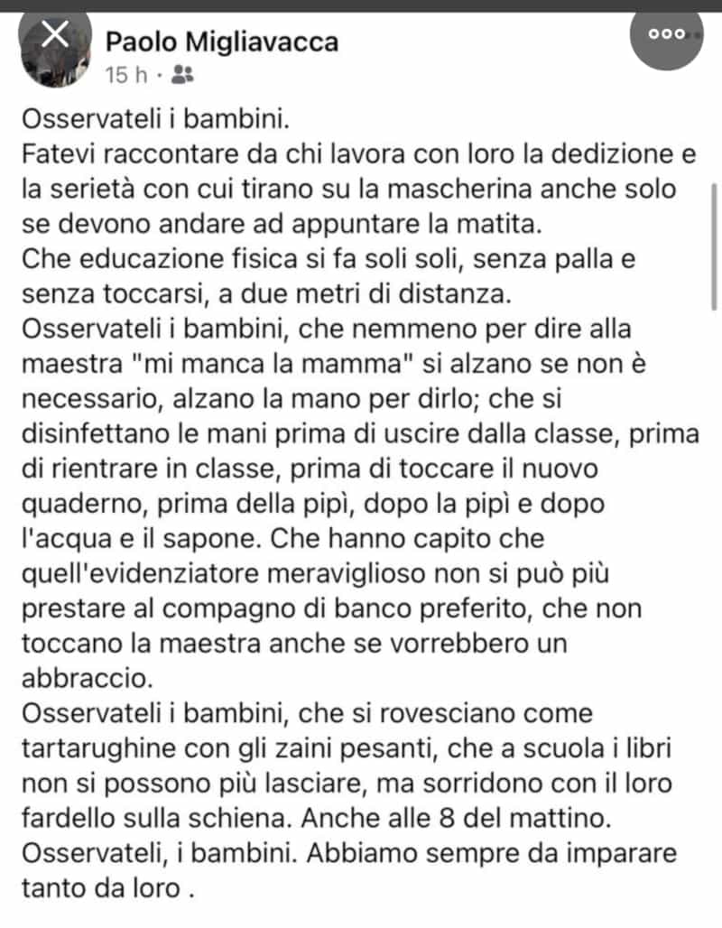 “Osservateli i bambini – scrive Migliavacca -. Fatevi raccontare da chi lavora con loro la dedizione e la serietà con cui tirano su la mascherina anche solo se devono andare ad appuntare la matita“.