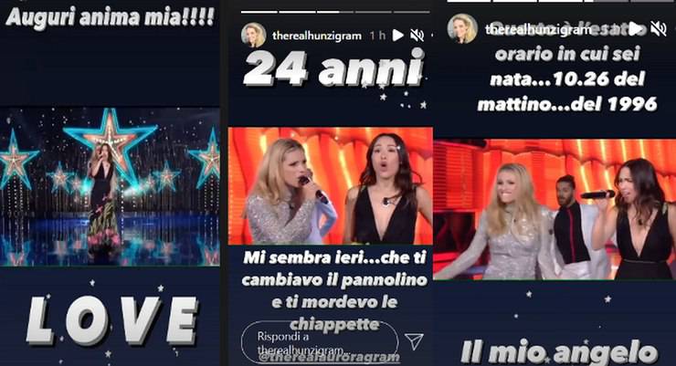 Nelle stories ha poi pubblicato un vecchio duetto con Aurora e con dei commenti simpatici e teneri allo stesso tempo: “Auguri anima mia“, “24 anni, mi sembra ieri che ti cambiavo il pannolino e ti mordevo le chiappette“, “Questo è l’esatto orario in cui sei nata: 10.26 del mattino…del 1996, il mio angelo“, per poi concludere con un grande “Ti amo“.