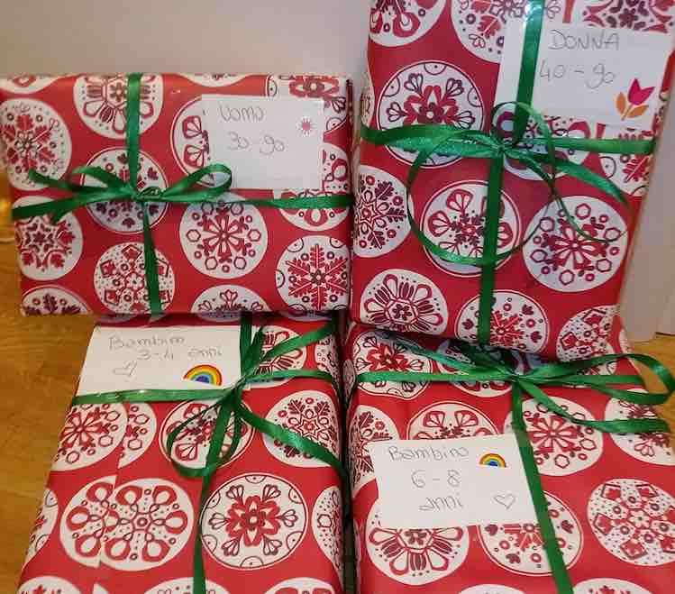Una volta riempita la scatola, va INCARTATA, DECORATA e VA SCRITTO in un angolo a chi è destinata: donna, uomo, bambina o bambino indicando anche la fascia di età.