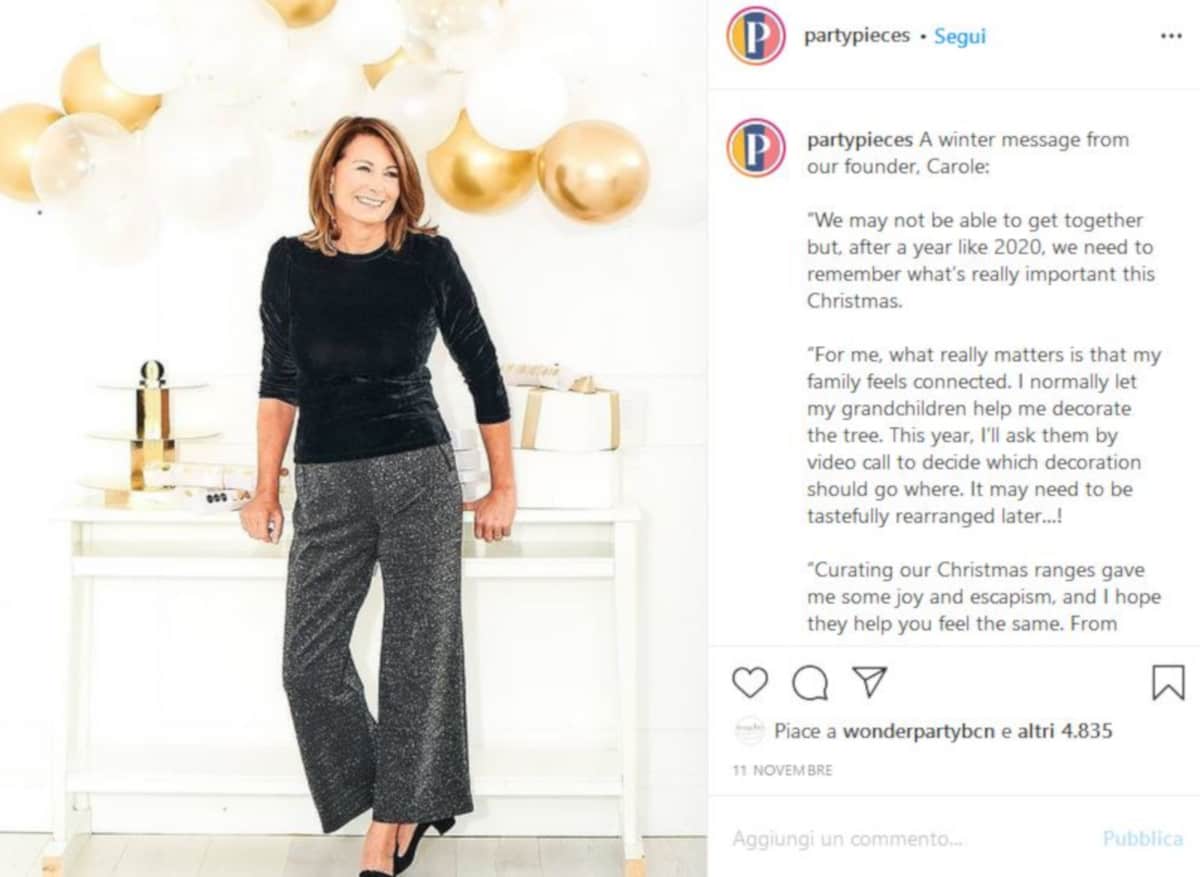 Così scriveva lo scorso novembre Carole Middleton sul profilo Instagram di Party Pieces, l’azienda di famiglia di oggettistica, arredi e decorazioni per le feste con sui i Middleton sono diventati milionari.