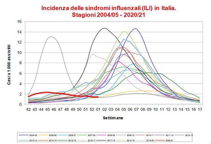 Sebbene i dati della rete di sorveglianza arrivino in ritardo e alcune Regioni non l’abbiano attivata, a causa dell’emergenza Covid che sta impiegando gran parte delle risorse sanitarie, generalmente la circolazione del virus influenzale in questa stagione 2020/2021 è molto bassa grazie in particolare all’uso delle mascherine e alle altre misure di prevenzione contro il Coronavirus. Le minori occasioni di contatto, con bar e ristoranti chiusi in gran parte d’Italia e nei giorni festivi, insieme alla chiusura delle scuole superiori, hanno limitato di molto i contagi.
