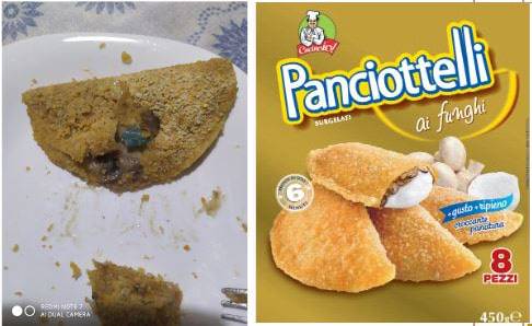 Nell’immagine qui sotto la foto della confezione del prodotto e il prodotto contaminato da un pezzo di plastica.