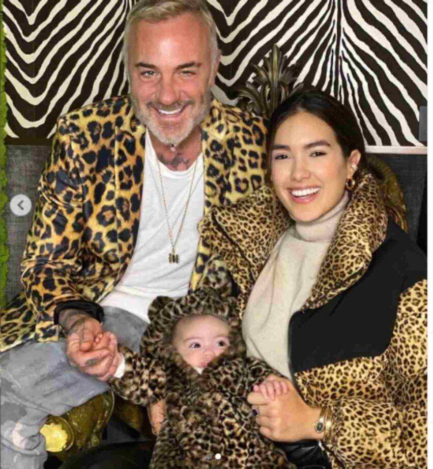 Nelle foto tutti e tre indossano dei capi animalier leopardati, per la precisione una giacca da uomo per Vacchi, un piumino caldo per Sharon Fonseca e una morbida tutina di peluche maculataper Blu Jerusalema che se ne sta placidamente in braccio alla mamma, mentre il suo papà le tiene una manina.
