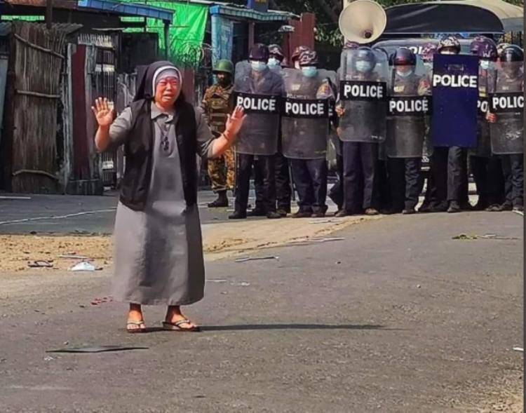 Suor Ann, in Myanmar, si è inginocchiata davanti alla polizia schierata in tenuta anti sommossa. La foto è diventata virale.